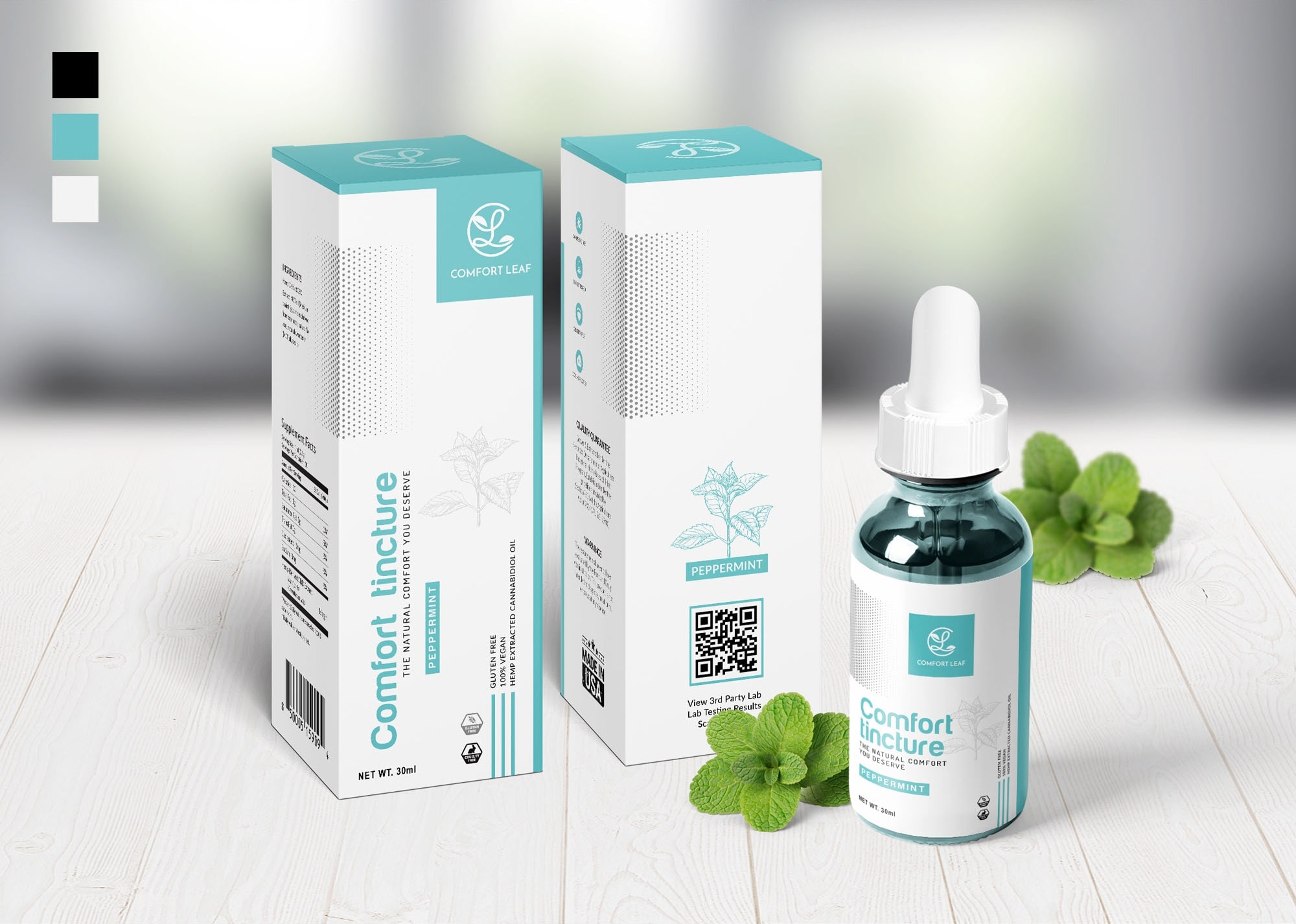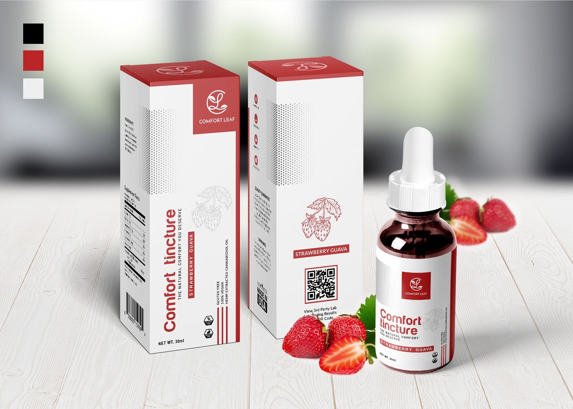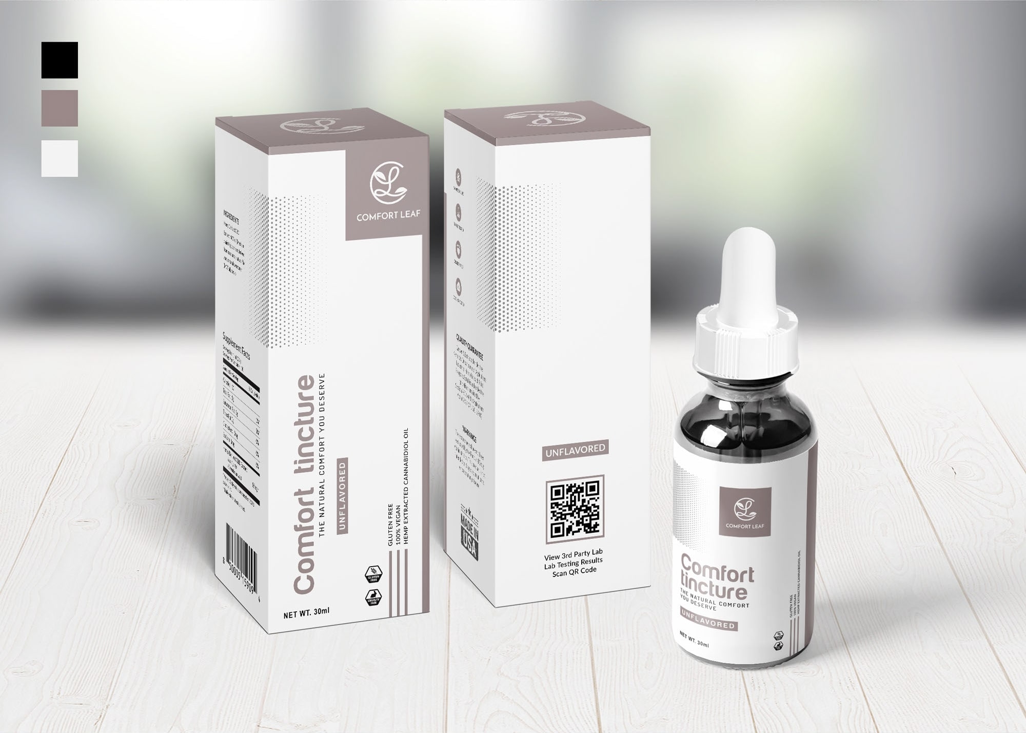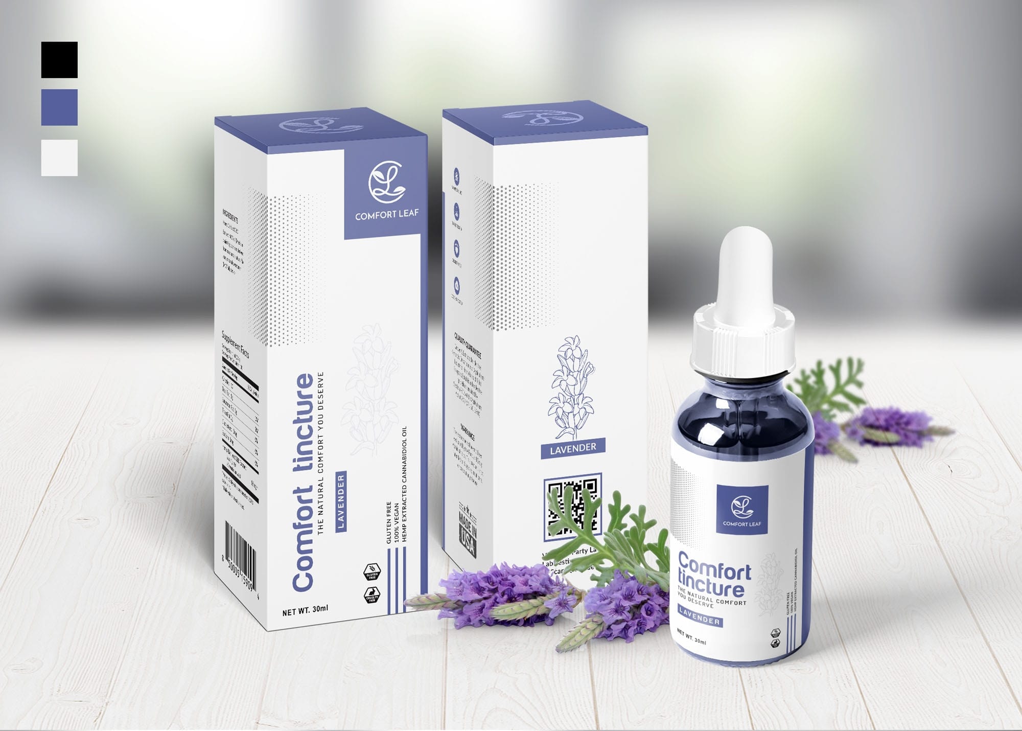 The outcome is a design that balances visual appeal with practicality, enhanced by a QR code for digital engagement. Overall, the Comfort Tincture packaging stands as an embodiment of quality and consumer trust.