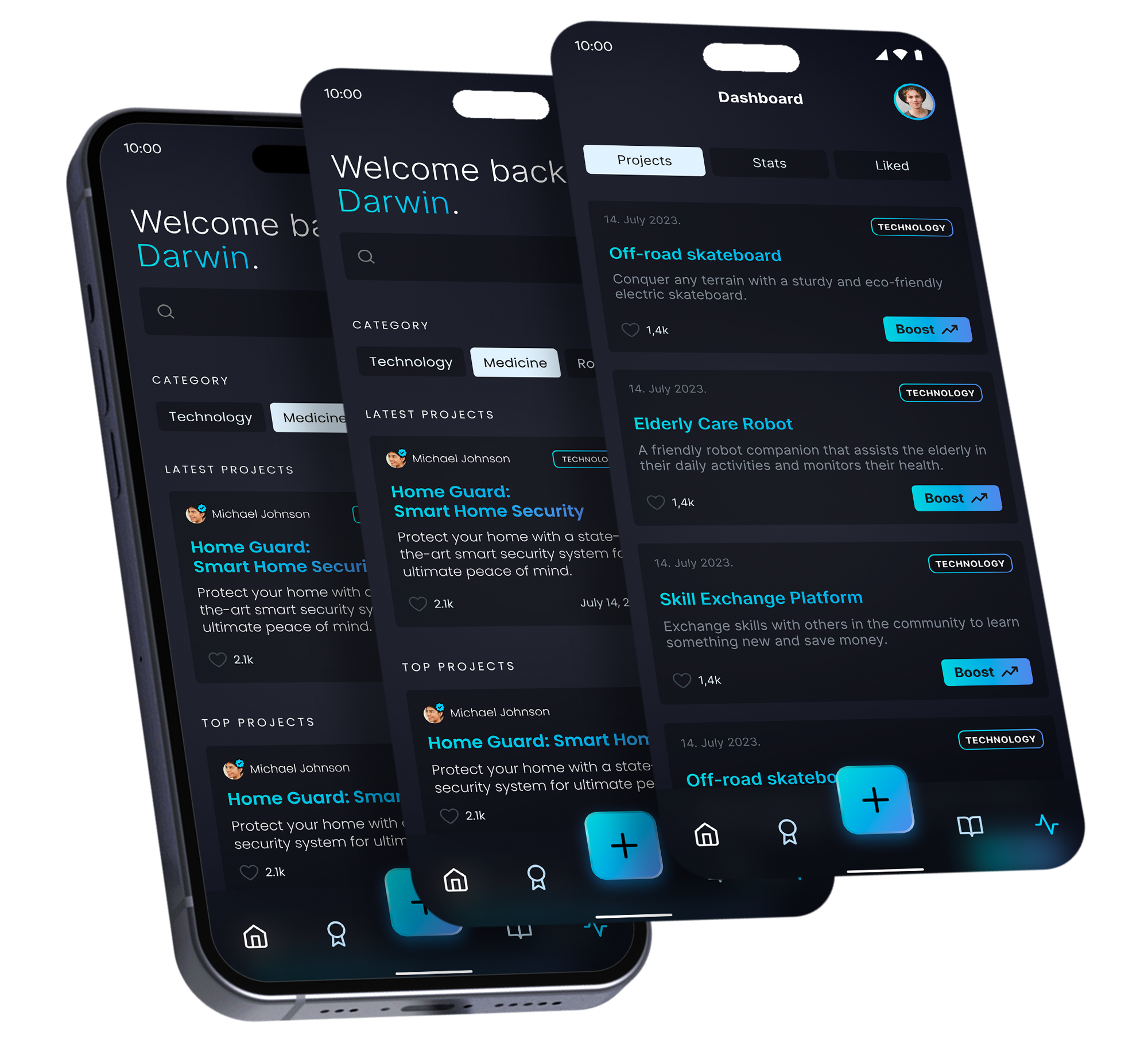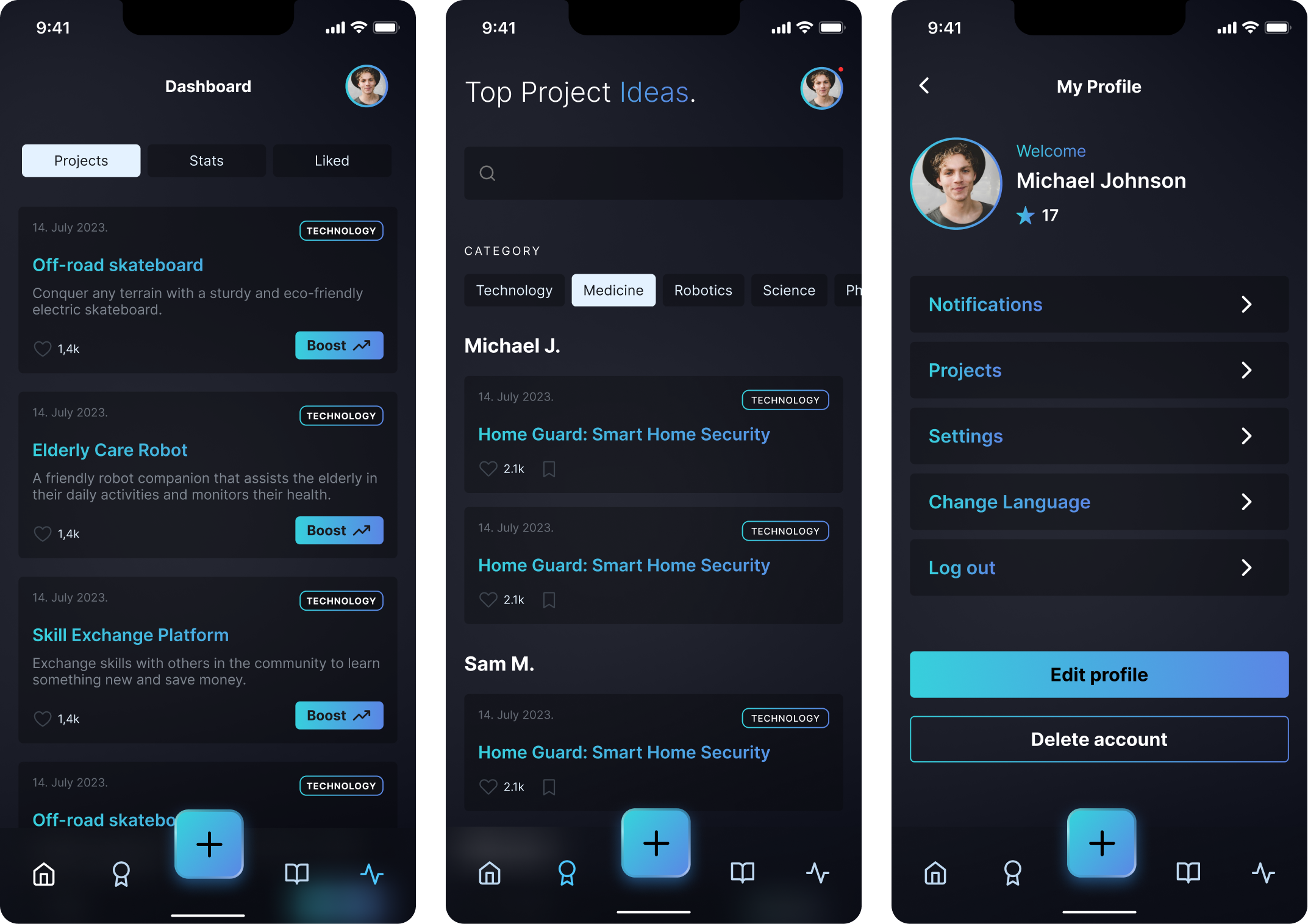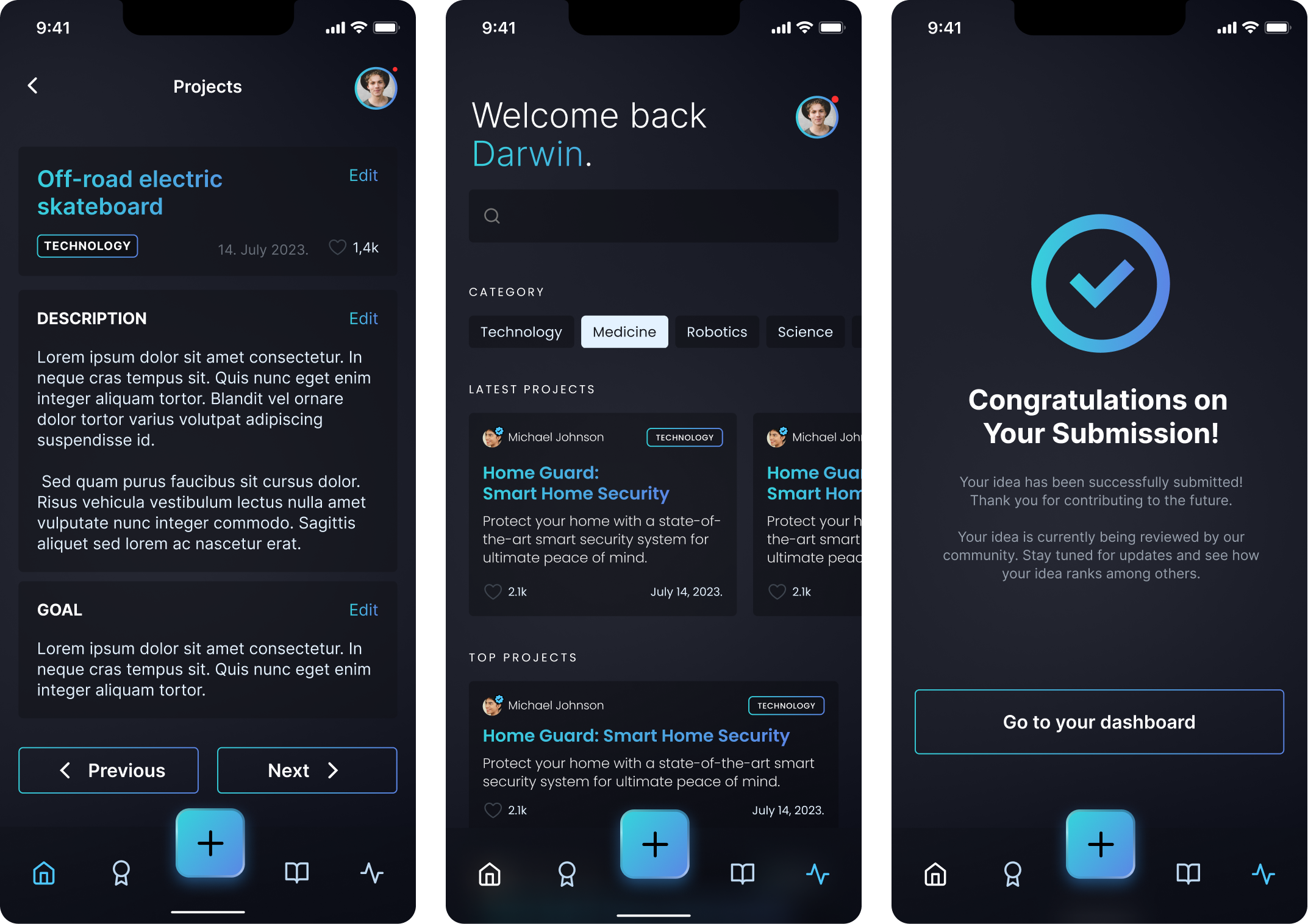 - Consistent Interaction Points: Common actions like 'Edit profile', 'Submit your idea', or accessing the 'Dashboard' are consistently placed across screens, making it easy for users to predict where to find these options.