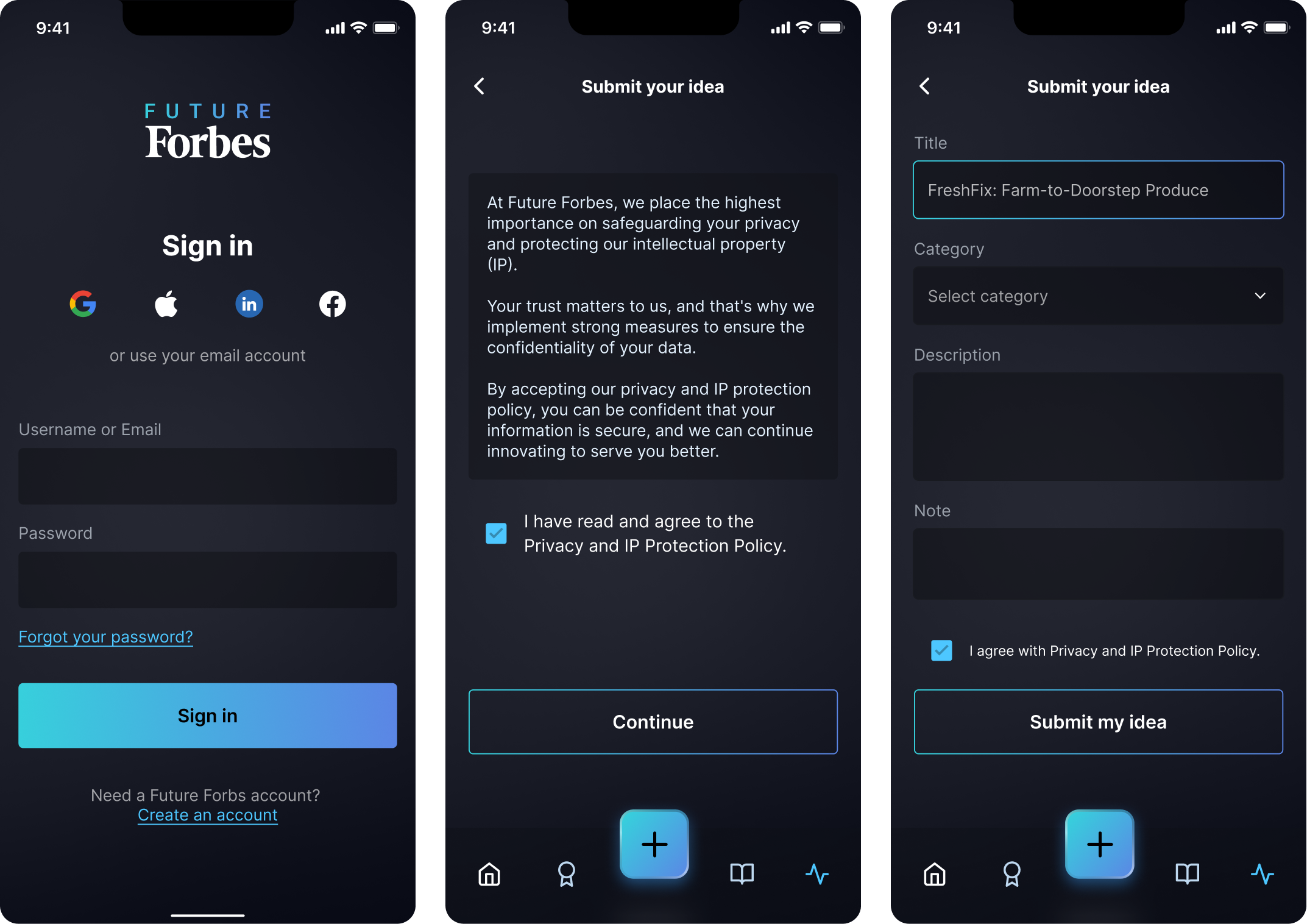 The UI design of "Future Forbes" emphasizes clarity and accessibility, with a dark theme that reduces eye strain and extends battery life. The use of bold typefaces and contrasting colors highlights important information and navigational cues. Custom icons and illustrations not only add to the visual appeal but also guide the user's journey through the app.