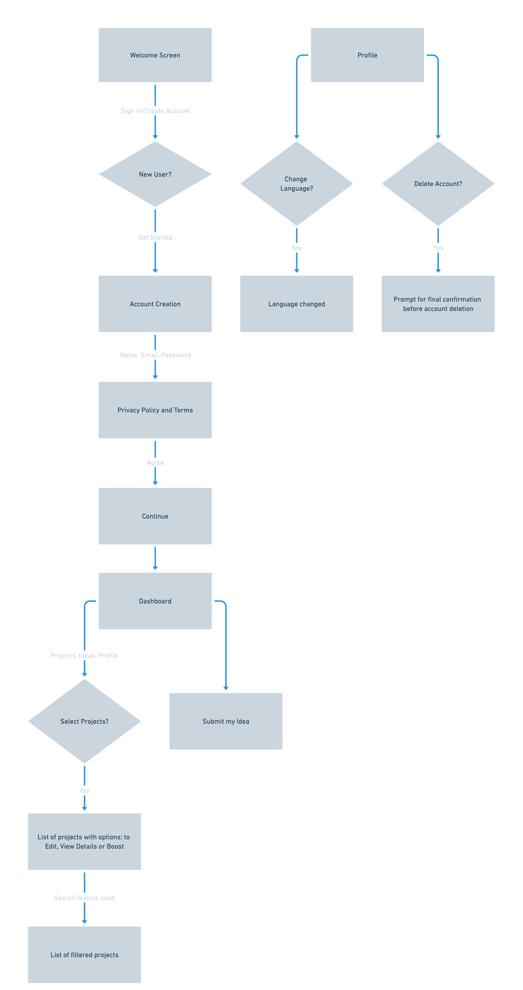 The Information Architecture of "Future Forbes" is meticulously crafted to foster an environment where innovators can share and discover ideas with ease. The architecture supports a user journey that begins with exploration—navigating through categories or using the search function to find projects of interest. Once engaged, users can interact with projects through likes and comments or proceed to submit their own ideas. The submission process is particularly noteworthy for its simplicity, encouraging even the most novice users to contribute to the community. Each step in the app's flow is designed to minimize friction and maximize user satisfaction, ensuring that the platform not only meets but exceeds the expectations of its creative audience.