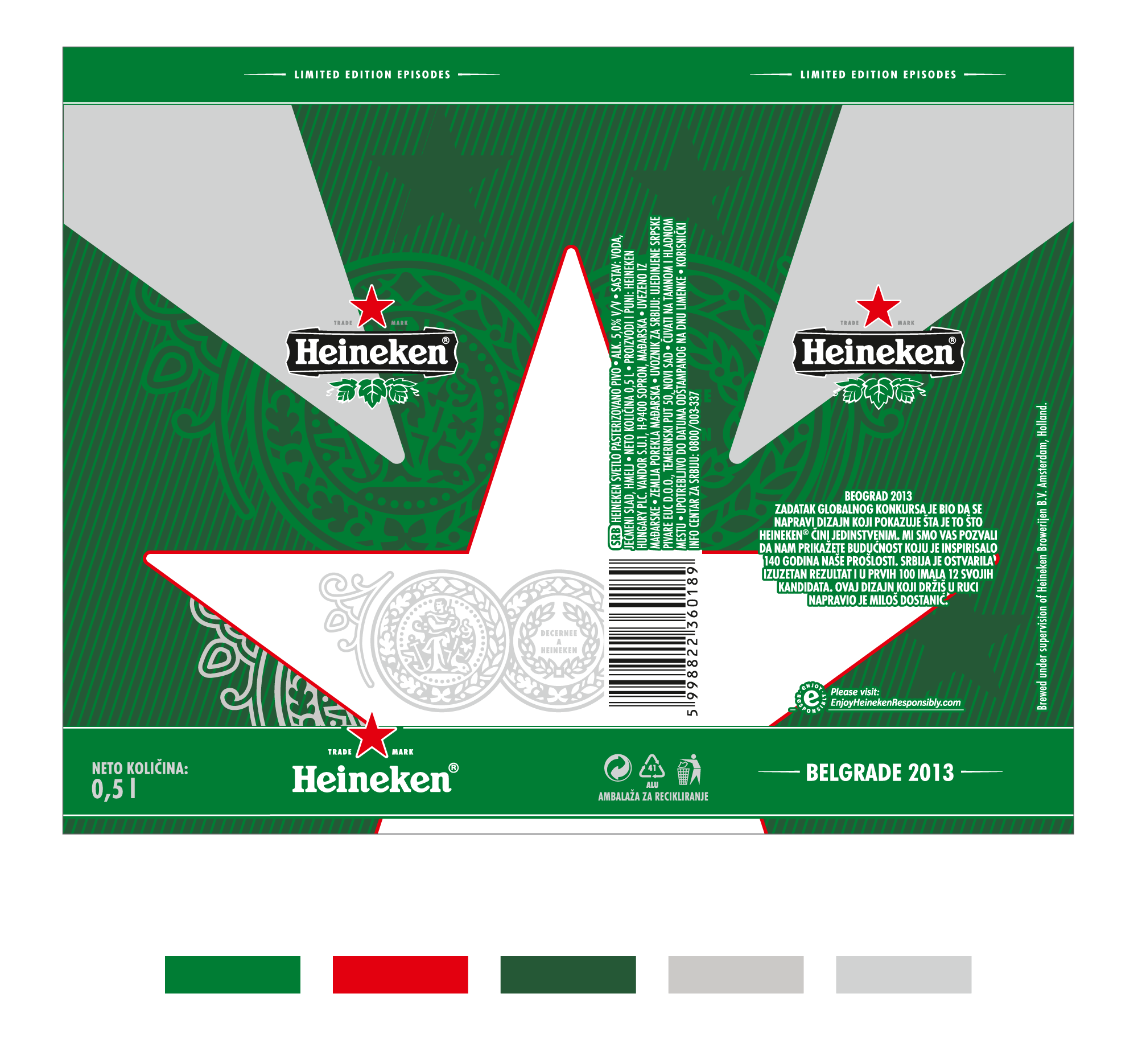 I participated in the Heineken Future Bottle 2013 contest, a prestigious and highly competitive worldwide design event. This notable competition attracted over 10,000 entries from around the globe, showcasing a vast array of talent and creativity. It was an honor for me to have my design among the final "Top30" and to have two others included in the "Top100". This recognition in such a distinguished contest was a significant milestone in my design career and led to the incredible opportunity for me to design the Heineken Can Limited Edition for Belgrade in 2013.